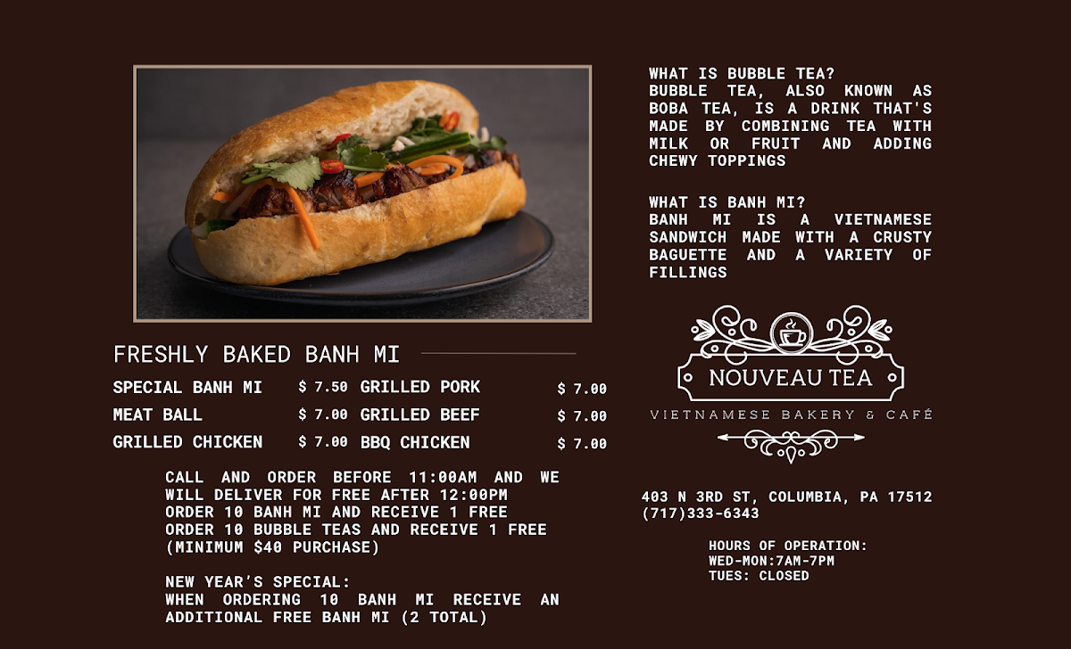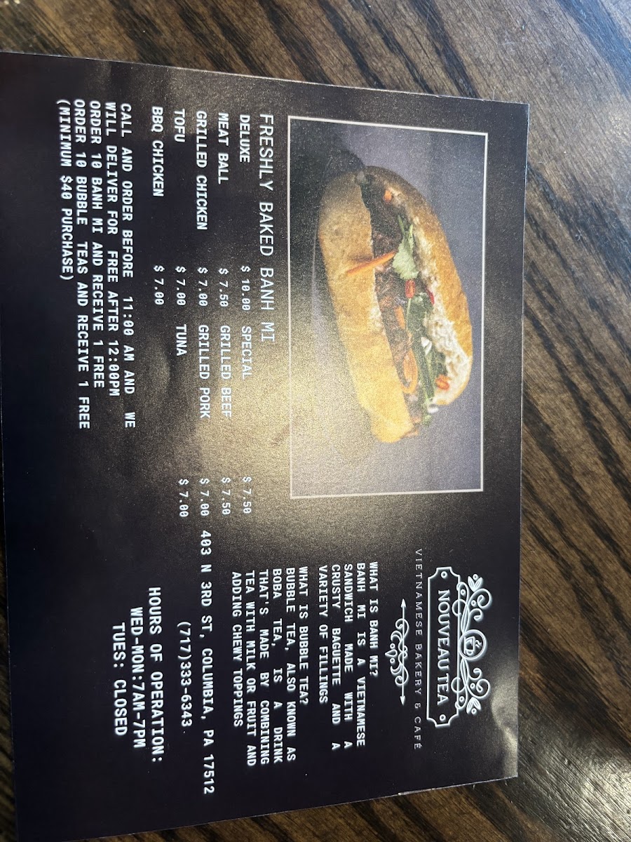 If you find yourself in Columbia, PA, make sure to carve out some time to visit Nouveau Tea - Vietnamese Bakery & Café, a delightful culinary gem located at 403 N 3rd St. This charming café is more than just a place to grab a quick bite; it’s a vibrant community hub that invites you in with its warm and welcoming atmosphere.